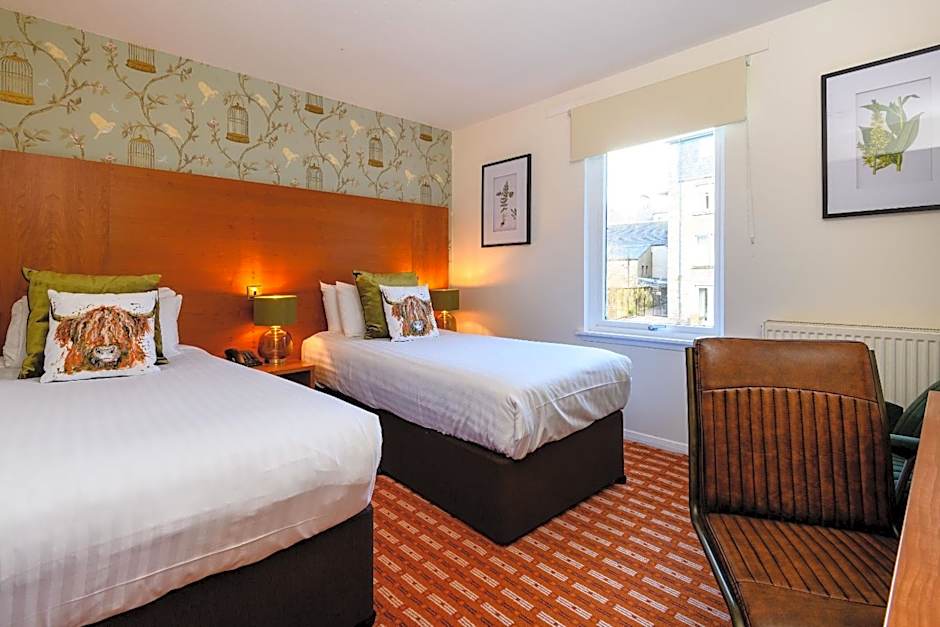 A seating area with a flat-screen TV, a desk and a private bathroom are offered in this family room. The unit has 2 beds.